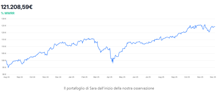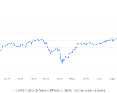 Il portafoglio di Sara è il più rischioso dei tre in termini di esposizione e volatilità e ad oggi ha un rendimento del +24,35% ma lei conosce perfettamente ogni rischio che ci stiamo permettendo di correre.